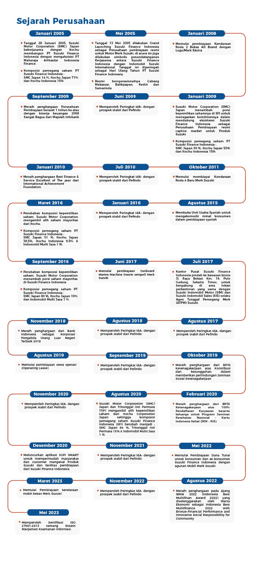 Sejarah berdirinya PT Suzuki Finance Indonesia (SFI) diawali oleh kerjasama antara 2 Perusahaan ternama di Jepang yaitu Suzuki Motor Corporation (SMC) Jepang dengan Itochu Corporation Jepang yang berkolaborasi mendirikan SFI dengan cara mengakuisi PT Maharaja Arthastar Indonesia Finance di awal Tahun 2005.